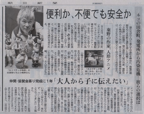2012/6/15 ネコマチッタ物語 今日、朝日新聞の神奈川版の朝刊に記事が出た。まあ〜大きく載せてくれたこと。ちょっと、恥ずかしいけどね。少し、切り口は違うけど、記者さんの気持ちは、伝わってきた。やはり、今の恥ずかしい首相にからめて、新しい扉を開いたというニュアンスを入れてほしかった。ここは、確実にネコマチッタは、新しい扉を開いて、簡単じゃないが、新しいエネルギーをみんなで考えればいい!という結論に達した。まあ〜これも、勉強だな。でも、このシナリオは、さすがに短く、要約されていたのは、参考になった。 |