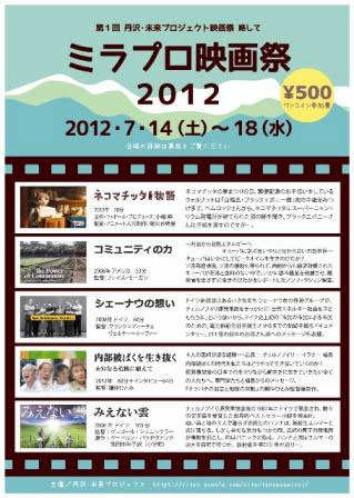 | 2012/6/27 ミラプロ映画祭 僕の住む町での映画祭だ!丹沢・未来プロジェクトの企画だ!エネルギーのこと、原発のこと、これからの生き方、僕達から、子ども達へ、みんなが感じて、考えて、未来を切り開こう!この会が出来て約1年、いろんなことやったけど、ココにネコマチッタが入ってるいることが嬉しい。詳しいことは、リンクから、丹沢未来のHPを見てね。 それから、ホントは、世界でも4大アニメーション映画のフェスティバルに出品したくて、制作を頑張ってきたのだけど、結局4月1日の締切に間に合わなかった。本編が出来たのは、5月の半ば.残念で仕方なかった。ダメもとでと思い、恥を忍んで、メールで「何とかできないでしょうか?」と送ってみた。そしたら、DVDを送ってくださいと、メールが来た。そして、送ると、この映画祭のプロヂューサーから、直々に電話をいただいた。 「いい映画です」から、始まり「本選には出品できないが、小さい会場だが、みんなに観てもらえるスペースがある。そして、広報にも載せられる。もし良かったら来なさい」と言ってくれた。そして、「2年後の本選を待とうと思っていました」と言ったら、「2年待つより、今の方がいいし、本選でなくとも、充分海外にもアピール出来ます」と言ってくれた。後で知ったが、このフェスティバルを創設した人だった。僕の無知にも程がある。 「私もピカドンという映画を創った、アニメーターです。あなた達の苦労はよくわかります.新聞社に紹介しておきました。私の出来ることはこのくらいです」「お恥ずかしい、メールを失礼しました.お許しください。広島に行きます。ありがとうございます」涙が出た.この映画の持つ力だと思った。