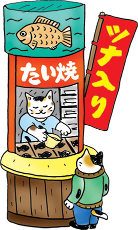 2013/3/8 猫町商店街 なんやかんやと、いろんなことが決まっていく時期。今日は確定申告。 お店や食べ物屋さんに行き、若い店員さんに、何か聞いたりすると、最後に「ダイジョウブデスカ?」という。コンビニで袋はいらないって言うと、やはり「ダイジョウブデスカ?」という。そんなに危うい感じに見えるのか?とも思うが、そういう意味ではないらしい。 あとよく言われるのは、「ホントデスカ?」最初から最後まで「ホントデスカ?」ってずっと言ってる若者がいる。そんなに僕の話が信じられないのか?とも思うけど、そういう意味ではないらしい。 このたいやきの猫おじさんに聞いてみたい。「ここのたいやきは、あんこ入りはないのですか?ないならツナ入りでもいいかな?」「ダイジョウブデスカ?」「じゃ〜ツナ入り3つください」「ホントデスカ?」なんとか、会話が成り立ってるかな?