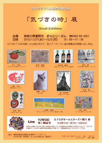 2013/11/10 気づきの時」展 ミラプロ映画祭が始まった。10月は、節約生活の大庭さんの座談会をやった。いろいろ言われたけど、大成功に終わったと思う。ただの節約方法ではなく、子供達とのふれあいを大庭一家から学ぶことは大きかったと確信した。スタッフも本当に適材適所でよく頑張った。ホットする間もなく、ミラプロの準備に入って、日記も書く余裕もなかった。途中に新宿燗屋の展示もあって、てんやわんやだった。 このミラプロ映画祭は、これで3回目だけど、スタッフの中から、1/4の奇跡という映画を上映したいという声が上がった。僕は観たことがなかったけど、試写を観て、やってみたいと思ったし、この町に移り住んで、いわゆる障碍を持った子供達との関わりが増えたこと。そして、その子達は障碍ではなく、そういう個性があり、絵を描いたり、感性が豊だということに気づいていた。 そして、この映画上映だけでなく、それに併せてアールブリュット的な展覧会が出来ないだろうか?と考えた。今までの付き合いの中で、基クンとは、仲良くしてもらっていたし、柏瀬クンとも仲がいい。それと、お客さんで前からすごい絵のうまい子がいるのだけど、絵を見てほしいと言われて見せてもらっていた山瀬さん。そして、そんなことをいろいろと人に言ったりしてたら、ホントに1週間ぐらいの間に、このメンバーが揃った。その中には、井深クンという子もいて、偶然が重なって参加してくれることになった。(話すと長いので割愛) しかし、こういうことを始めると、どこからか、いろいろな声も入る。1/4の奇跡の映画に関しては、このカーコちゃんのプロパガンダだと言った人には、正直ビックリした。この世にプロパガンダじゃないことなんて本当にあるのだろうか?みんな、自分のことをプロデュースして生きて行ってる訳で、僕だって、プロパガンダ的なことは、毎日やっている。それから、こういった障碍のある子達の展覧会をやって、何かしらそれを売り物にしているんじゃないのか?的なことも言われた。それこそ、大きな間違いである。どこにも障碍者とは、書いていないし、そういう個性や特性を持っていることを認めているのである。それが、たまたま、世間では、障碍者というレッテルを貼られているだけである。色眼鏡で観ることは、誰もある。その壁を作っているのは、それを言っている当人達ではないだろうか? 僕は、今回のことで、何一ついいことをしていると思ってはいない。もしかしたら、僕のやってる行為は、その子達にとって、とんでもなくこれからも、もっと生きづらいことになってしまうのではないかと、懸念もしている。ひっそりと絵を描くことを楽しんでいた人もいるのかも知れない。そんなことを、山瀬さんの通う作業所の所長に吐露したら、「確かに、彼女が今注目されていることで、他の子が少し焼きもちを焼いているかもしれないです。でも、それも、この子達の人生です。一歩前に進みましょう」と言ってくれた。 この会に参加することを断念した人達もいる。僕はその子の絵を見て涙が出るほど、胸を打たれた。それは、太い筆で、画面いっぱいに描いた自分の名前だった。普通には読めないけど、それは現代アートの作家が描いた絵よりも胸をえぐった。45秒で描いたという。「最初は4秒しか机の前に座っていただけなくて 」とその子の絵の先生は言う。その絵は、「私はここにいる!」と観る者にうったえる絵なのだ。「私よ!」って・・・・僕は、絵の前でこうべを垂れた。 この会を準備することで、誰よりも僕が一番勉強になって、感じさせていただいているのかも知れない。ありがとう! 感謝。